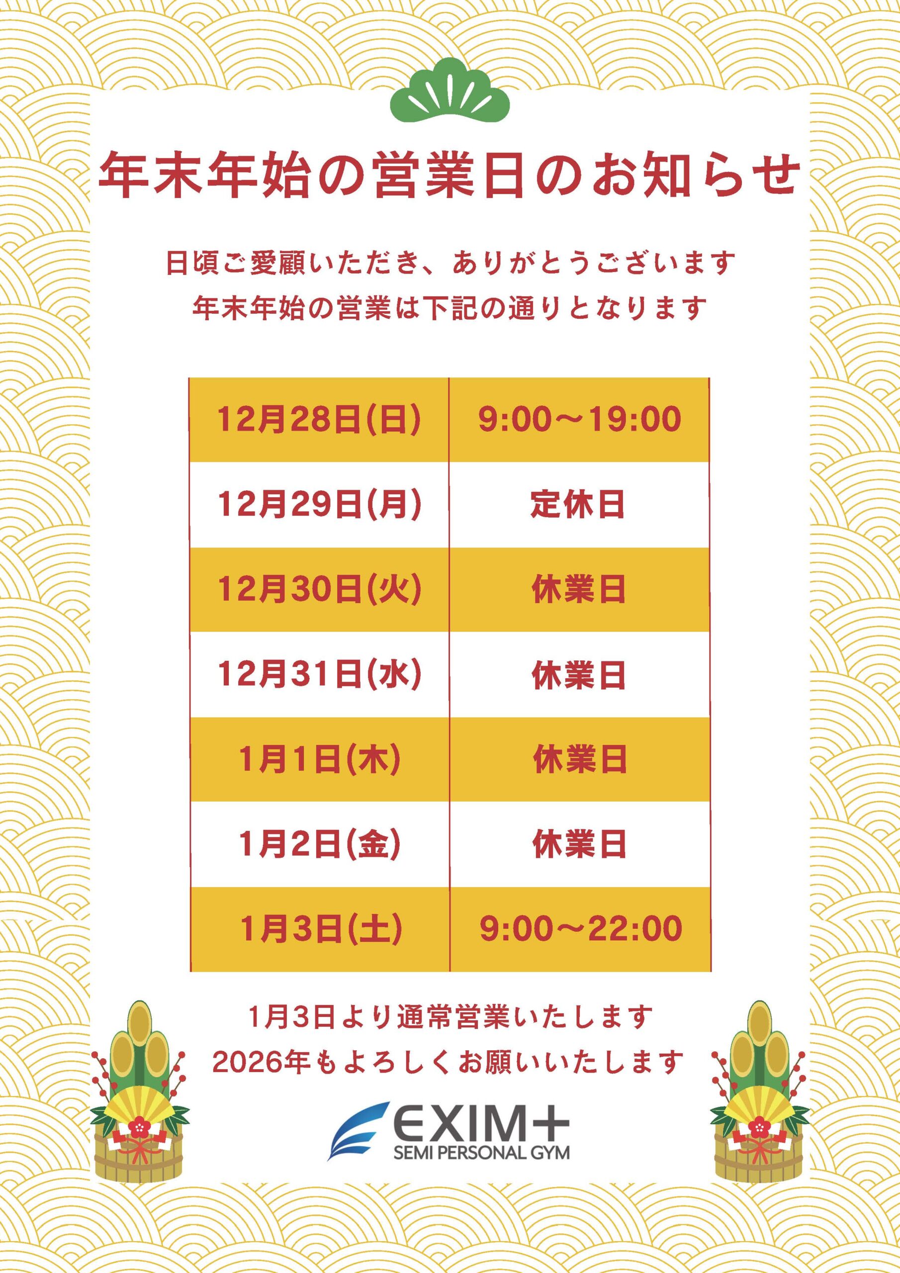 来年もセミパーソナルジムEXIM+を、何卒よろしくお願い申し上げます。